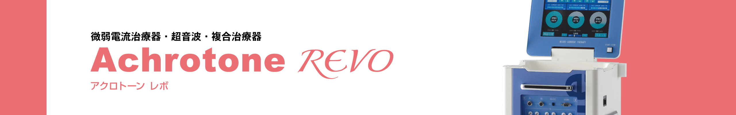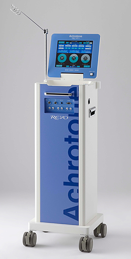 アクロトーンは急性自覚痛疾患の即効性に期待。微弱電流(マイクロカレント)を用いて細胞内のイオンチャンネルを活性化させ損傷組織の修復を図り、疼痛緩和、浮腫軽減、筋寛解に作用する。 吸着 ・ Y ・ ポイント・ハンドの4種治療電極と N ・ M ・J モードの出力波形を選択設定し、電極間導電度をモニターしながら治療を進める新しい発想の微弱電流治療。 新機能電極間相互通電システム&吸着パルス超音波コンビネーション治療。 液晶タッチパネル画面。