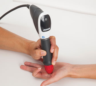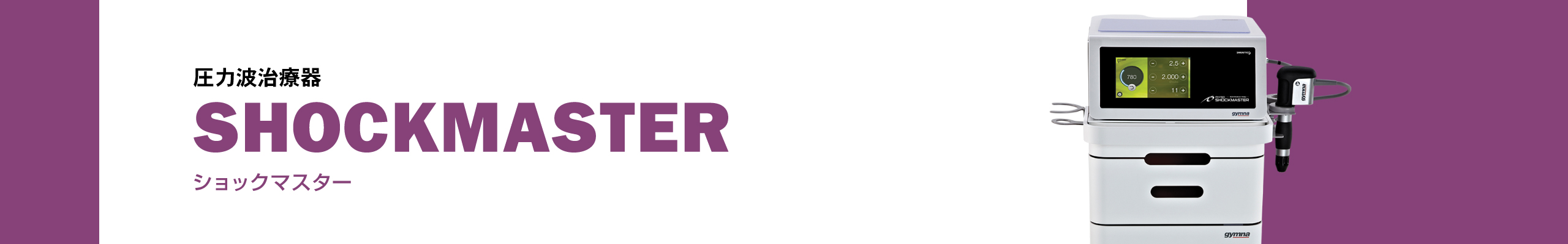 世界65か国で広く使用されているショックマスターは圧力波エネルギーと振動エネルギーを使った“痛みの治療器”。圧縮空気によりピストンが衝撃体にぶつかって発生した圧力波を患部に伝える圧力波拡散型ショックウェーブ療法は筋・腱疼痛疾患にアプローチ。集中型に比べて拡散型の圧力波は刺激が柔らかく、医師以外でもオペレート可能。