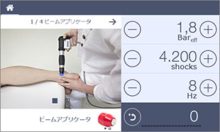 治療部位に対しての具体的なショット数、出力強度、周波数などを画面を見ながら使用できます。