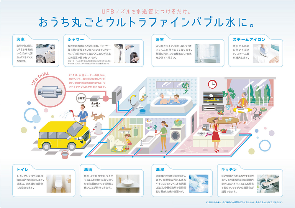 水道の元栓取り付けで、家・ビル・クリニック全体をウルトラファインバブル水に変えます。 メンテナンスフリーで汚れの付着を防止。SDGs達成に有効。透析液の清浄。歯科の治療水。飲用水テストクリア。